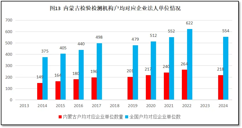 由图13可见,12年来,内蒙古自治区检验检测机构户均对应的企业法人单位数量缓慢上升,但远低于全国平均数。2024年内蒙古自治区检验检测机构户均对应企业法人单位218个,比全国平均数554个低了336个。