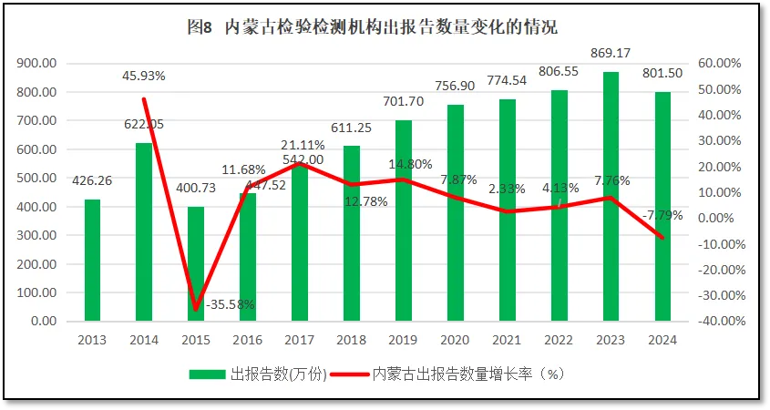 从图8来看,除了2014年较为异常的数据之外,从2015年起,内蒙古自治区检验检测机构出具报告数量逐年上升,到2023年内蒙古自治区检验检测机构出具的报告数量869.17万份,是历年最高。2024年,内蒙古自治区检验检测报告数量出现下跌,为801.50万份,是2013年出报告数量的1.88倍。从增长率曲线来看,刨除2014和2015年较为异常的数据起伏外,从2016年起,内蒙古自治区检验检测机构出具报告数量增长率总体稳中走低,到2024年降为负值,过去10年的年均增长率为3.9%。