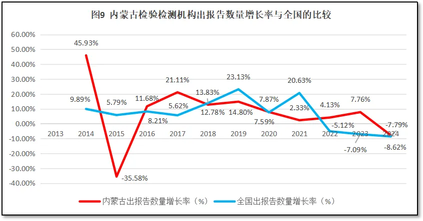 内蒙古自治区检验检测机构出具报告数量的增长率与全国检验检测机构出具报告增长率的比较如图9所示。
