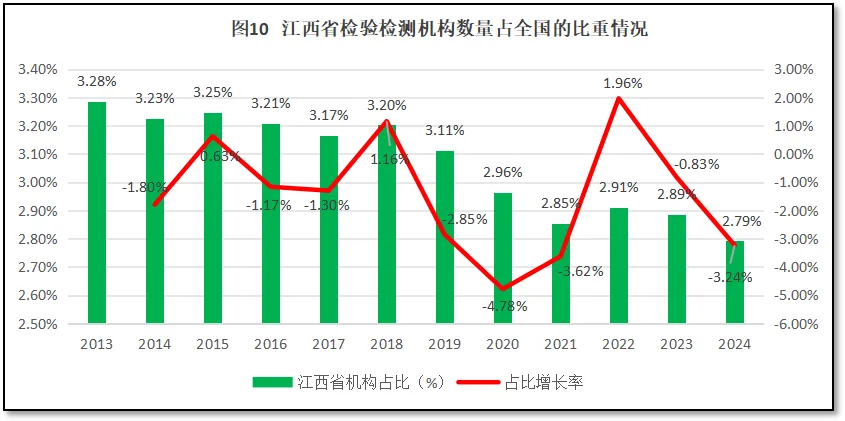 由图10可见,江西省检验检测机构数量在全国检验检测机构总数中的占比从2013年的3.28%逐步降低到2024年的2.79%。从增长率的变化情况来看,多数年份江西省检验检测机构数量的占比增幅为负,年均增幅为-1.44%。