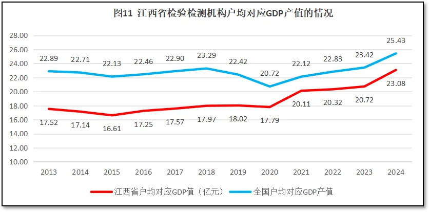 由图11可见,江西省检验检测机构户均对应的GDP值呈现一个先降后升的变化,从2013年的17.52亿元降低到2015年的16.61亿元,之后慢慢又回升到2024年的23.08亿元,增幅总体不大。从江西省户均对应GDP的值与全国情况进行比较可见,江西省的数值一直低于全国平均数,最近几年两者的差距有所缩小,保持在2-3亿元左右。江西省的数据变化趋势表明,受限于区域经济相对落后,江西省检验检测机构数量显得稍多,但这一情况正在逐步改善之中。