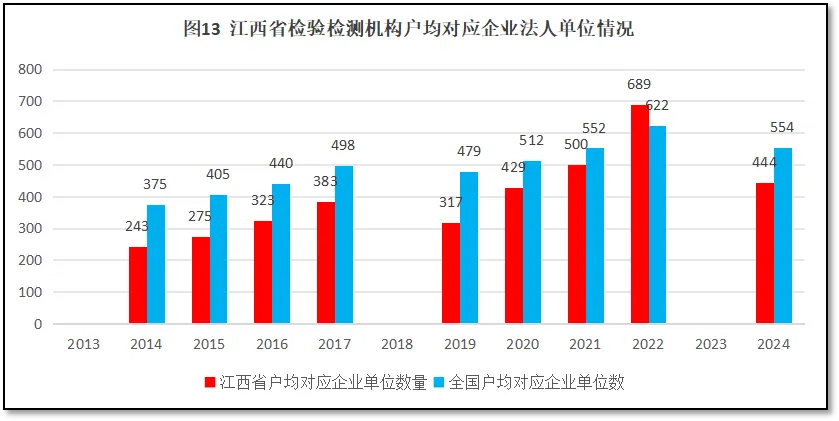 由图13可见,12年来,江西省检验检测机构户均对应的企业法人单位数量增长较快,并于2022年超过全国平均数。但是,基于第五次全国经济普查数据来看,2024年江西省检验检测机构户均对应企业法人单位444个,较前几年出现回落,再次被全国平均数反超,比全国平均数低110个。