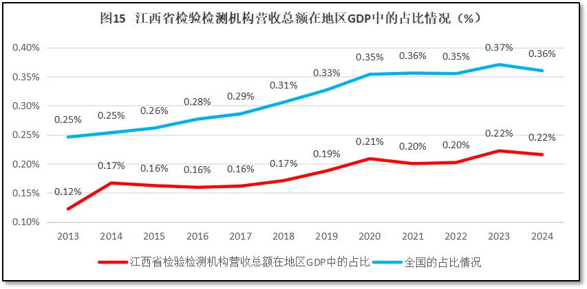 再来看江西省检验检测机构营收总额在其地区生产总值GDP中的占比情况。2024年度,江西省检验检测机构营收总额73.72亿元,占当年江西省GDP值的0.22%,比全国平均值0.36%低了0.14%,排名全国第29位,较2023年度排名下降1位。过去12年江西省检验检测机构营收总额在当地GDP值的比例变化情况如图15所示。