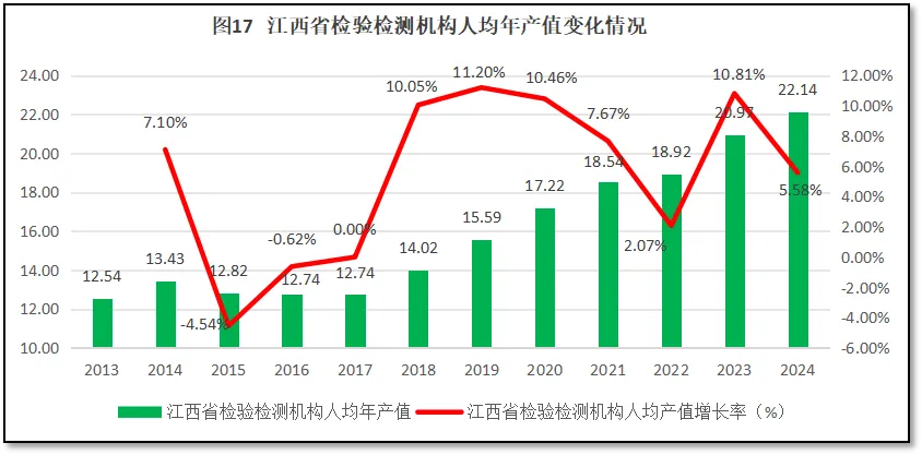 由图17可见,2024年度,江西省检验检测机构人均年产值22.14万元,离30万元行业温饱线和2024年度全国31.45万元的人均产值还有不小距离,排名居于全国第20位(由高往低排序),在全国处于中等偏下水平,且排名较2023年度还下降了2名,说明在与其他省份的比较之中江西省处于落后的状态。