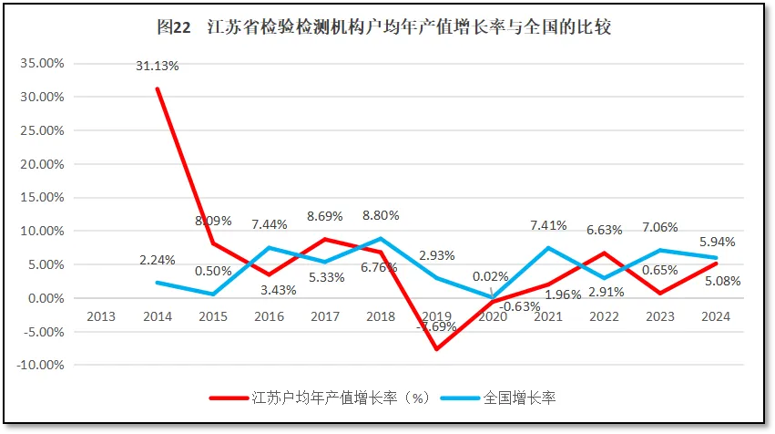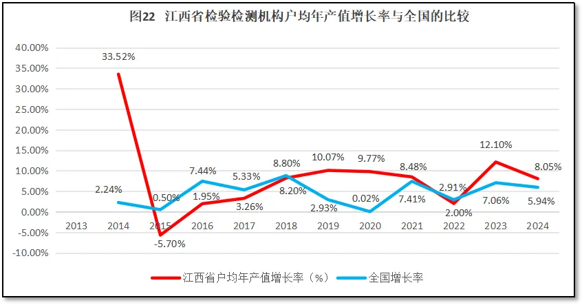 再来看江西省检验检测机构人均年产值增长率与全国人均年产值增长率的比较,如图19所示。