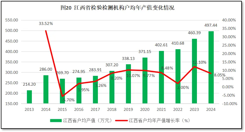 由图20可见,江西省检验检测机构户均营收总体保持缓慢增长,2024年末的户均营收是2013年的2.32倍。从增长率的曲线来看,除了头两年数据误差导致增长率异常之外,从2015年起,江西省检验检测机构户均营收增长率缓慢增加,到2019年出现10.07%的较高增速后增长率开始下降,到2022年下降到2.00%。2023年,增长率出现了12.10%的较高反弹,但2024年回落到8.05%。这些数据说明,江西省检验检测机构虽然受限于区域经济不景气,其营收增长相对缓慢,但增幅比较稳定,且江西处在沿海省份经济二次转移的必经之路上,后续经济发展速度会进一步加快,其检验检测行业营收后续增长提升的潜力很大,可能会渐渐改善江西省检验检测行业的运行处境。