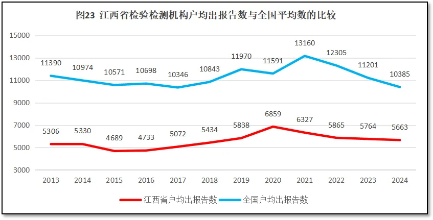 由图23可见,江西省检验检测机构户均出报告数量总体比较平稳,在2020年出现一个相对较高的增幅后又逐步回归,十余年来户均出报告数量始终在5500份左右波动,没有显著增长。不过江西省户均出报告数量一直比全国平均数低,2024年江西省比全国平均数低了4722份。