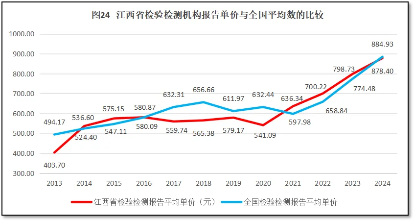 来看江西省检验检测报告单价的情况,过去12年江西省检验检测报告单价与全国情况的比较如图24所示。