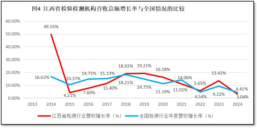 比较江西省检验检测行业年度营收总额增长率与全国检验检测行业年度营收总额增长率随时间的变化,如图4所示。