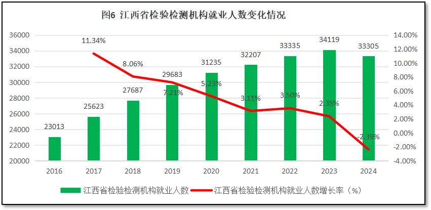由图6可见,最近9年江西省检验检测机构从业人员数量从2016年的2.3万人增长到2023年的3.41万人之后,2024年就业人数也首次出现下降,为3.33万人,净减少814人。从增长率曲线看,江西省检验检测机构从业人数增长率逐年下降,从2017年同比增幅11.34%下降到2024年的-2.39%。