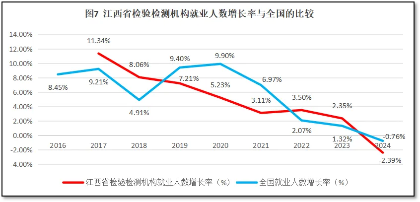 江西省检验检测机构就业人数增长率与全国检验检测机构就业人数增长率的比较如图7所示。