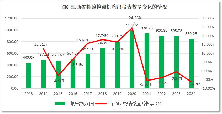 从图8来看,2020年之前,江西省检验检测机构出具报告数量逐年上升,到2020年达到993.92万份的峰值后开始逐渐下降,2024年江西省检验检测机构出具的报告数量回落到839.25万份,是2013年出报告数量的1.94倍。从增长率曲线来看,从2015年起,江西省检验检测机构出具报告数量增长率先增后降,在2020年出现一个高增长(24.36%)后增速大跌,连续四年为负增长,2024年度的增长率为-6.30%。
