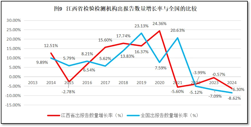 江西省检验检测机构出具报告数量的增长率与全国检验检测机构出具报告增长率的比较如图9所示。